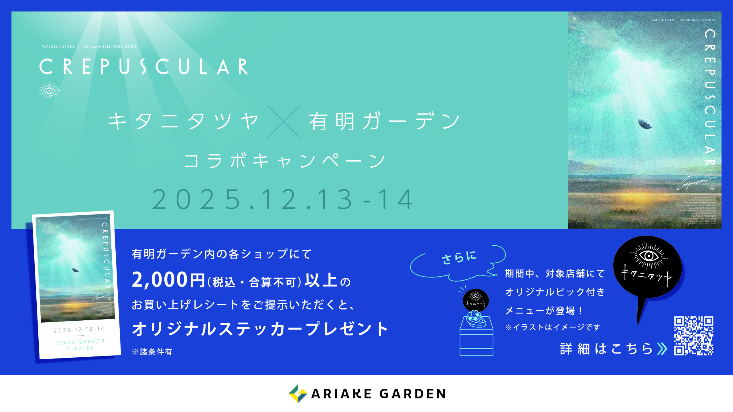 12月13日(土)~14日(日)に開催する「キタニタツヤ One Man Hall Tour 2025 “Crepuscular”」の公演を記念し、有明ガーデンとコラボキャンペーンを実施いたします。
